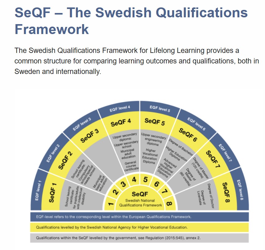 Švedska je ena izmed držav, ki je na tem področju naredila največji napredek. Njeno nacionalno ogrodje kvalifikacij (SeQF) je bilo že od začetka zasnovano kot odprt in vključujoč sistem, ki poleg formalnih omogoča tudi umeščanje neformalnih kvalifikacij. Postopki temeljijo na zakonski in podzakonski podlagi, ki določa jasne definicije, strukturo ravni in postopke za vključevanje ter spremljanje kvalifikacij. Novela iz leta 2022 je še dodatno razširila dostopnost, saj lahko vlogo za umeščanje zdaj vloži tudi nosilec kvalifikacije, ne le izvajalec.